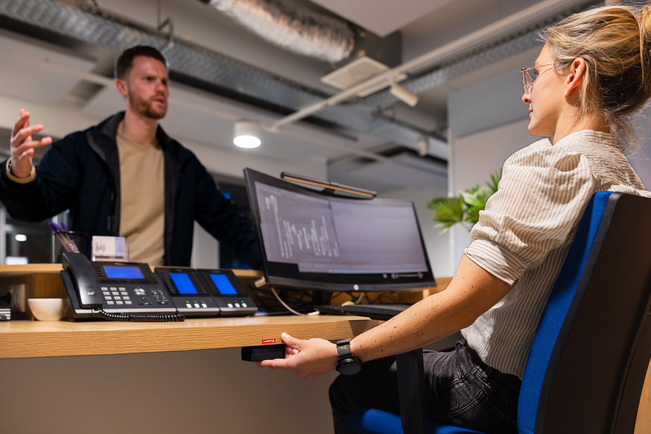Schakel direct hulp in bij agressie aan de balie of receptie. Je kunt discreet alarm slaan door de alarmknop in te drukken. Het apparaat trilt kort om je te laten weten dat er alarm is geslagen. De melding wordt vervolgens verstuurd naar het SOSvolaris platform waar vooraf ingestelde scenario’s worden opgestart.
